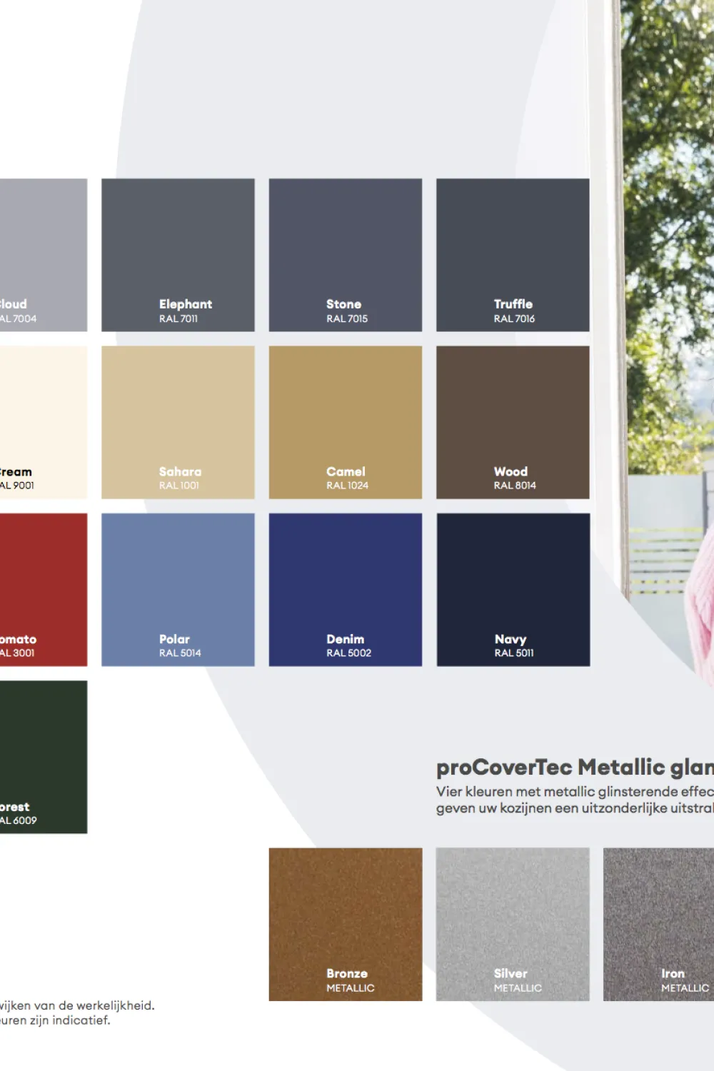 Aan de buitenkant grijs maar aan de binnenkant liever wit RAL 9010? Dankzij ons unieke systeem krijgt uw kozijn aan alle kanten kleur, binnen, buiten, zelfs in de sponning. U bepaalt zelf welke combinatie u maakt dus laat uw creativiteit de vrije loop. Er is altijd een kleur die bij u past en bij de actuele trends.